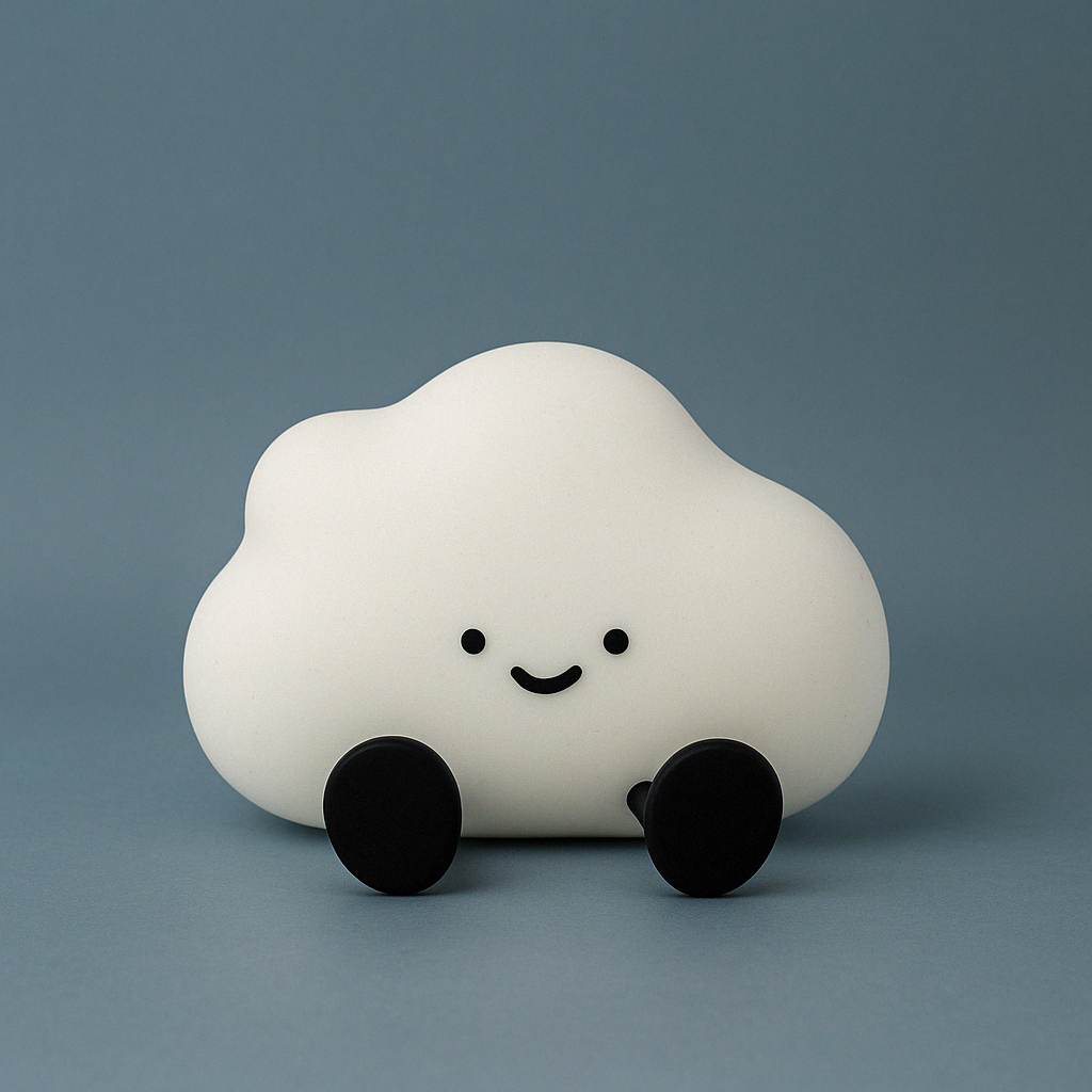 Pilou, c’est le nuage le plus doux du ciel, avec ses petites jambes noires qui pendent comme s’il flottait dans les airs. Toujours souriant, il diffuse une lumière apaisante qui fait tomber la nuit tout en légèreté.