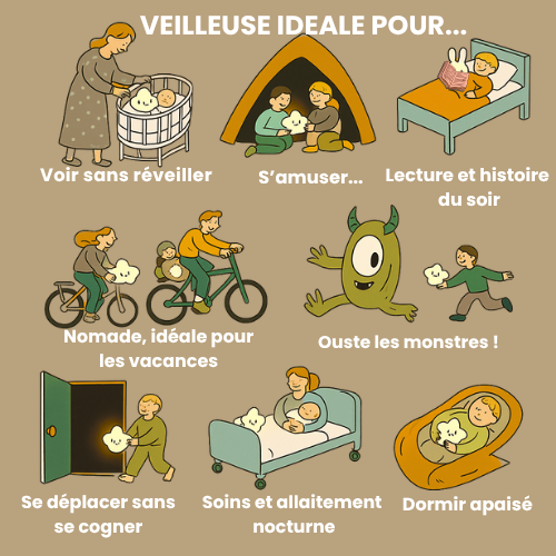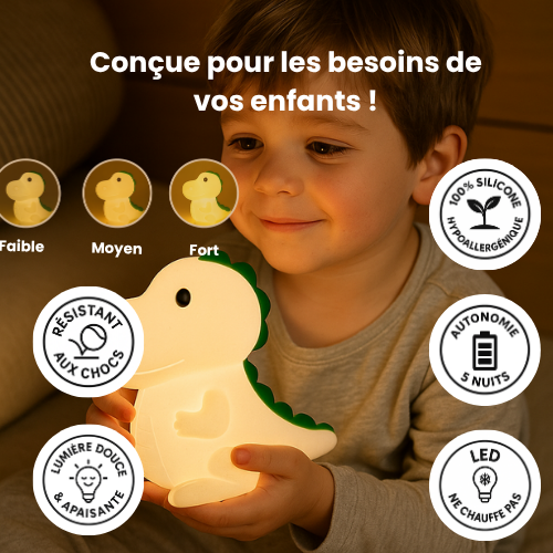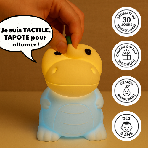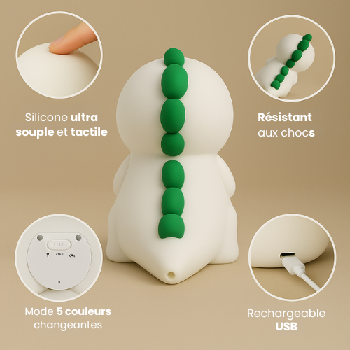 Dino est un petit crocodile assis avec une expression déterminée et pleine de douceur. Sa présence apporte une ambiance ludique. La lumière douce de Dino crée une atmosphère rassurante, parfaite pour accompagner les nuits.
